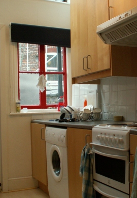 Modern fitted kitchen with washing machine.